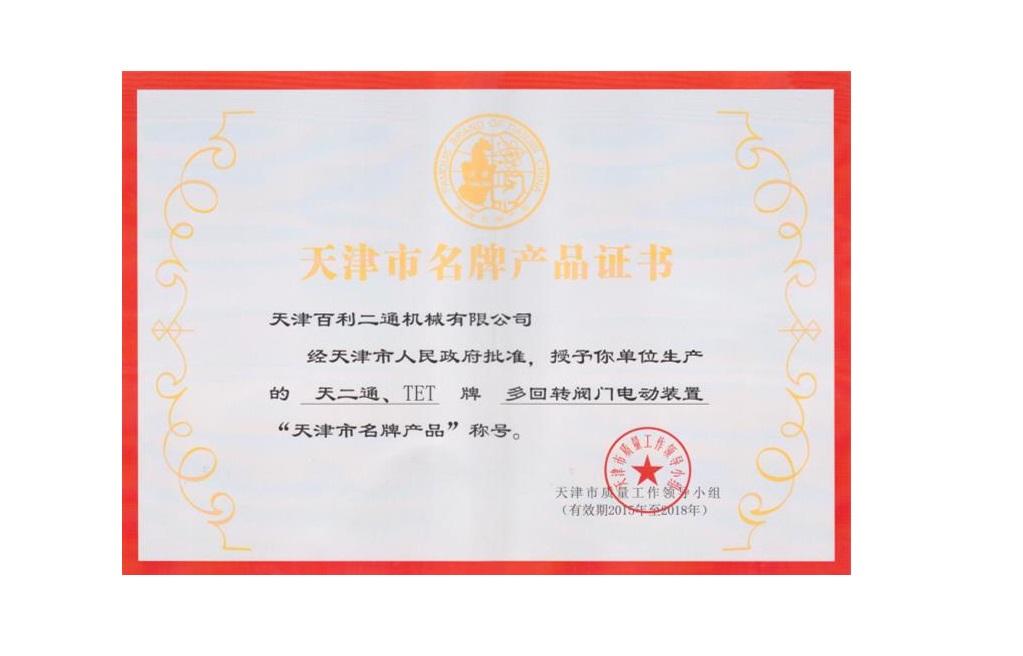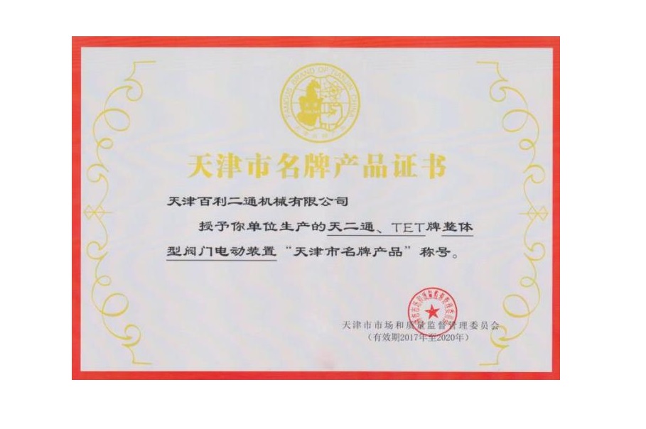 整體型閥門電動裝置名牌產(chǎn)品證書