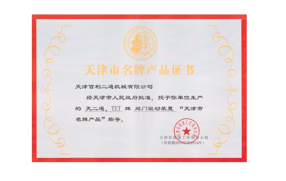 閥門驅(qū)動裝置名牌產(chǎn)品證書