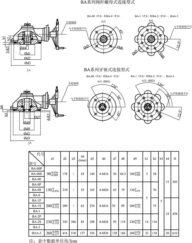 BA系列閥門手動裝置,是一種多回轉閥門驅動裝置,它適用于閘閥、截止閥等類型閥門。該裝置內部裝有閥桿螺母,而且在與閥門裝配后具有可方便地取出閥桿螺母的特點。閥桿螺母的螺紋形式及尺寸通常由用戶根據所配閥門自行加工。整機傳動效率高,安裝使用方便。