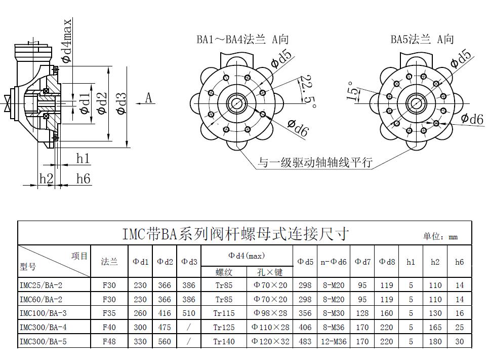 IMC/BA系列閥門電動(dòng)裝置是一種組合型多回轉(zhuǎn)閥門電動(dòng)裝置。它適用于閘閥、截止閥等類型的閥門。BA系列產(chǎn)品是可同時(shí)承受轉(zhuǎn)矩和軸向推力(通常稱為扭矩推力型)的圓錐齒輪閥門驅(qū)動(dòng)裝置。其傳動(dòng)型式可以滿足右旋手動(dòng)操作閥門為“關(guān)”的標(biāo)準(zhǔn)要求,結(jié)構(gòu)緊湊且大圓錐齒輪便于設(shè)置內(nèi)部有一定直徑的貫通孔輸出軸,可使明桿閥門的閥桿在開啟時(shí)從輸出軸的內(nèi)孔伸出。BA系列產(chǎn)品可與中小轉(zhuǎn)矩規(guī)格的多回轉(zhuǎn)電動(dòng)裝置組合成為較大輸出轉(zhuǎn)矩規(guī)格的組合式多回轉(zhuǎn)閥門電動(dòng)裝置。