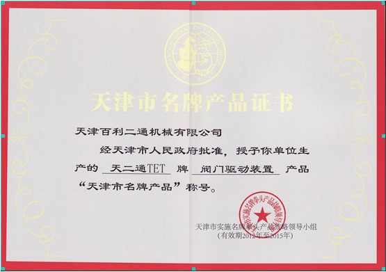 "Day two pass TET" brand valve actuator products won two consecutive Tianjin Famous Brand, from Machinery Co., Ltd. Tianjin Baili two long-term attention to product quality, brand advantage into full play, enhance core competitiveness, insist the lead implementing brand strategy results.