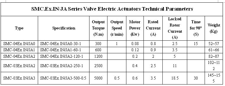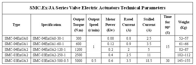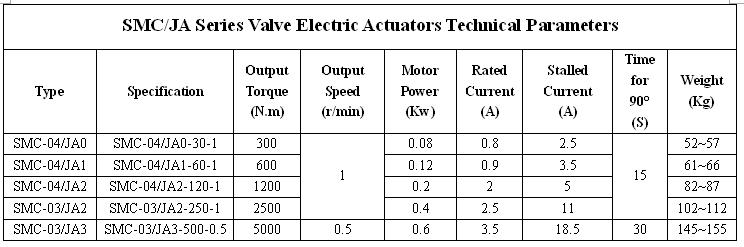 SMC/JA ,part-turn valve electric actuators , are used in ball valve,butterfly valve and motorized air dampers. This seris is always consist of SMC multi-turn electric actuator and JA part-turn speed reducer.The conditions of temperature numidity,elevation and level of protection are up to SMC standard