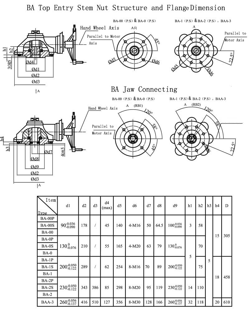 BA series valve manual device, is a multi-turn valve actuators. It is suitable for gate valves, globe valves and other types of valves. Stem nut thread forms and sizes are usually processed by the user depending on their own with the valve. High transmission efficiency, easy to install