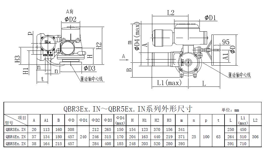 QBR3~QBR5是我公司研制的部分回轉(zhuǎn)閥門電動裝置,控制轉(zhuǎn)矩范圍:900N.m~12000N.m。該電動裝置可與球閥﹑蝶閥等閥瓣做90°回轉(zhuǎn)的閥門組合成電動閥門,其功能是控制閥門的啟閉。該電動裝置能夠進(jìn)行單機(jī)或多機(jī)室內(nèi)控制遠(yuǎn)距離控制電動操作和現(xiàn)場手動或電動操作,可廣泛地應(yīng)用在具有管道閥門的工業(yè)系統(tǒng)。該產(chǎn)品的防護(hù)等級為IP67,隔爆型產(chǎn)品(型號中有Ex)的隔爆等級 為dⅡBT4。